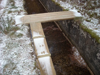 - Instalación de 18 puentes-rampa en Morana y 12 en Morca de madera, sujetos a las paredes del canal mediante pletinas metálicas.